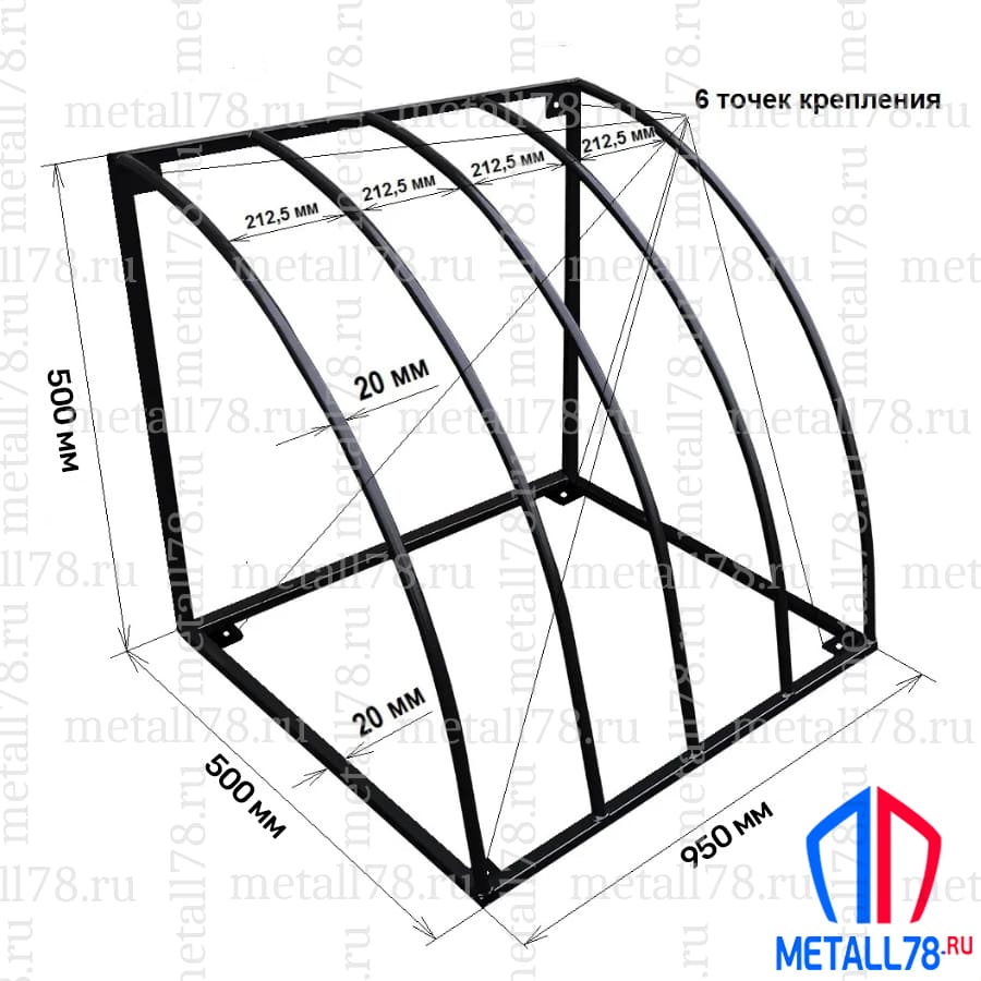 - В основаниях велопарковки имеются 6 площадок из стали толщиной 2,0 мм с отверстиями Ø 10,5 мм, для крепления велопарковки к вертикальной и горизонтальной поверхностям, а также крепления велопарковок между собой (крепеж в комплект не входит);